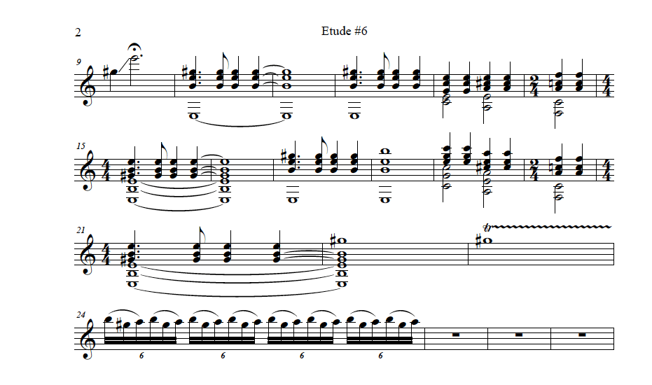 I am currently composing 10 etudes for the classical guitar. I am writing them for myself, to become a better guitarist, and I am also composing them for anyone interested in incorporating new techniques in their playing. Extended techniques are a great way to increase the expressive nature of this beautiful instrument.